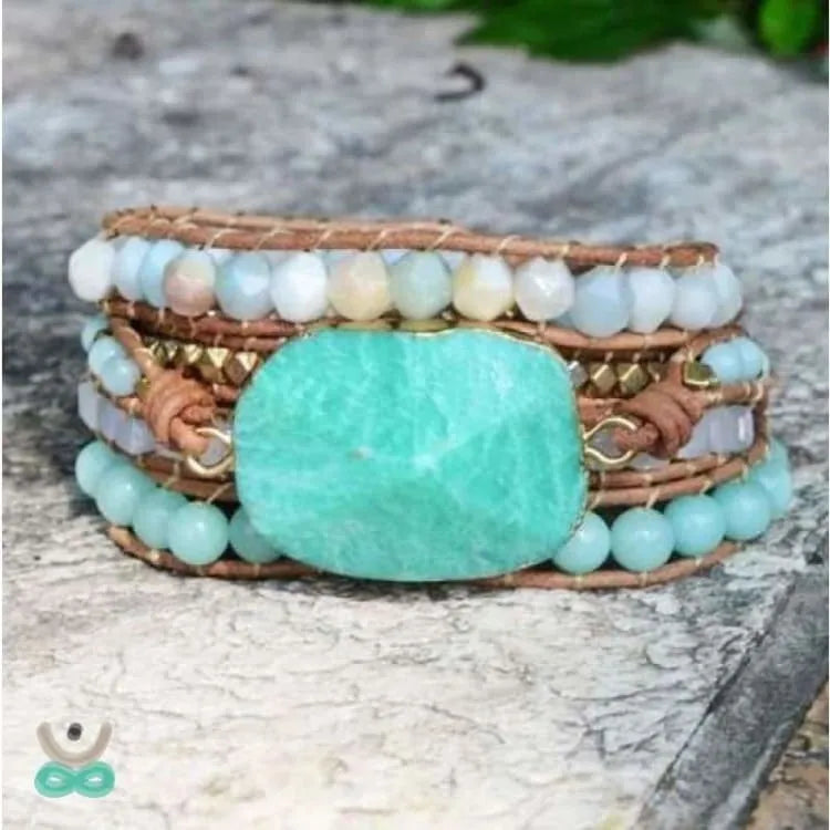 Descubre el brazalete de envoltura de Amazonita, es ajustable al tamaño de tu muñeca gracias a sus 3 niveles de cierres fáciles de colocar.