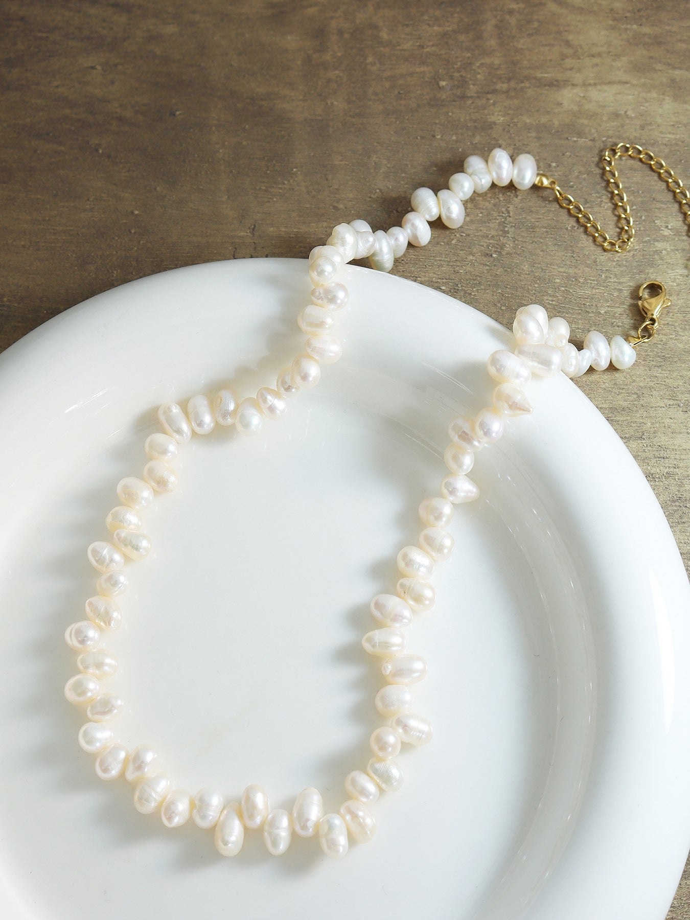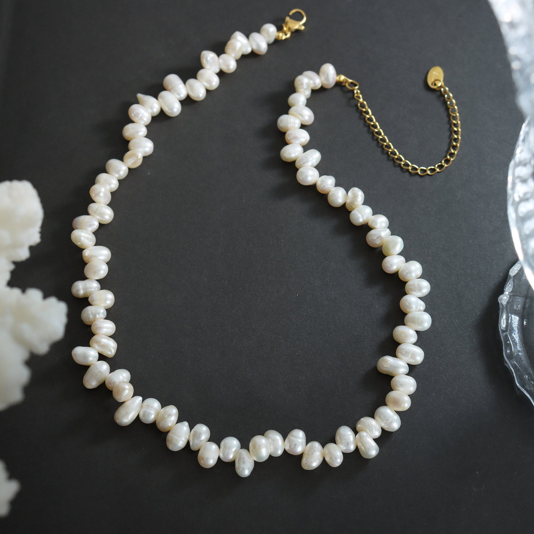 Este collar es mucho más que un simple accesorio. Sus perlas de agua dulce son formadas naturalmente, lo que significa que cada una tiene una forma única y especial, reflejando tu individualidad. Su diseño de estilo "Barroco Francés" te permite lucir una pieza elegante y sofisticada, perfecta para cualquier ocasión. La cadena tiene una longitud ideal de 43 cm de diámetro, adaptándose cómodamente a la clavícula. Es una joya artesanal que te ayuda a equilibrar las emociones y a promover la calma.