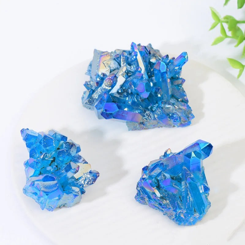 Una joya de energía celestial. Este impresionante racimo de cuarzo natural ha sido tratado con galvanoplastia de titanio, dándole un brillo iridiscente que potencia tanto su belleza como sus propiedades energéticas.