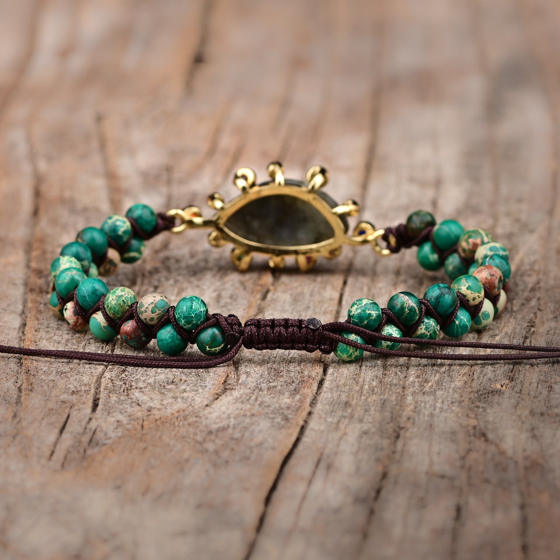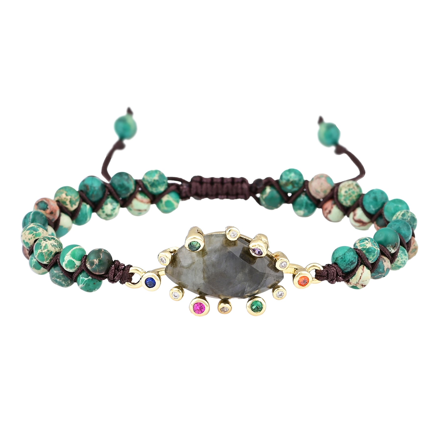 Una pulsera mágica con labradorita natural en el centro, rodeada de cuentas verdes y toques de color que despiertan tu energía interior. Tejida a mano con detalles únicos.