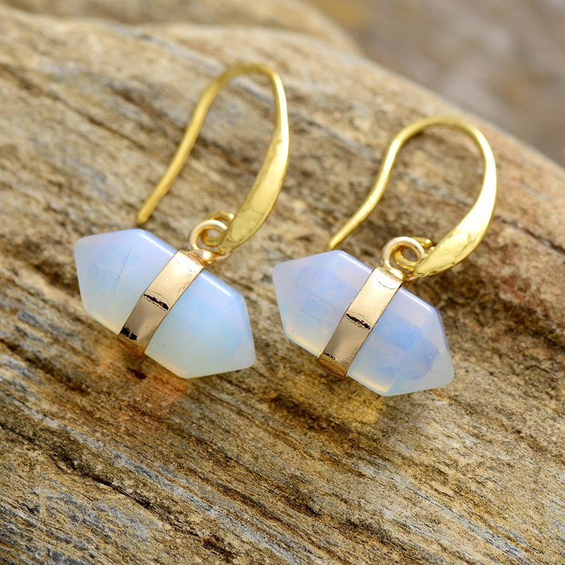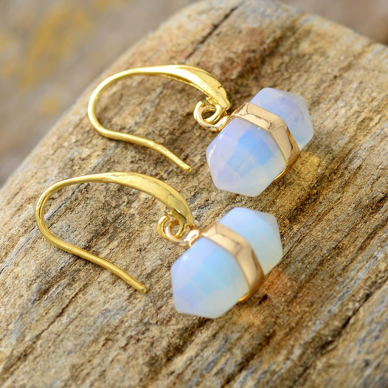 Atrae la energía de la piedra lunar con estos pendientes geométricos de diseño moderno. Ideales para quienes buscan equilibrio, luz interior y un complemento elegante.