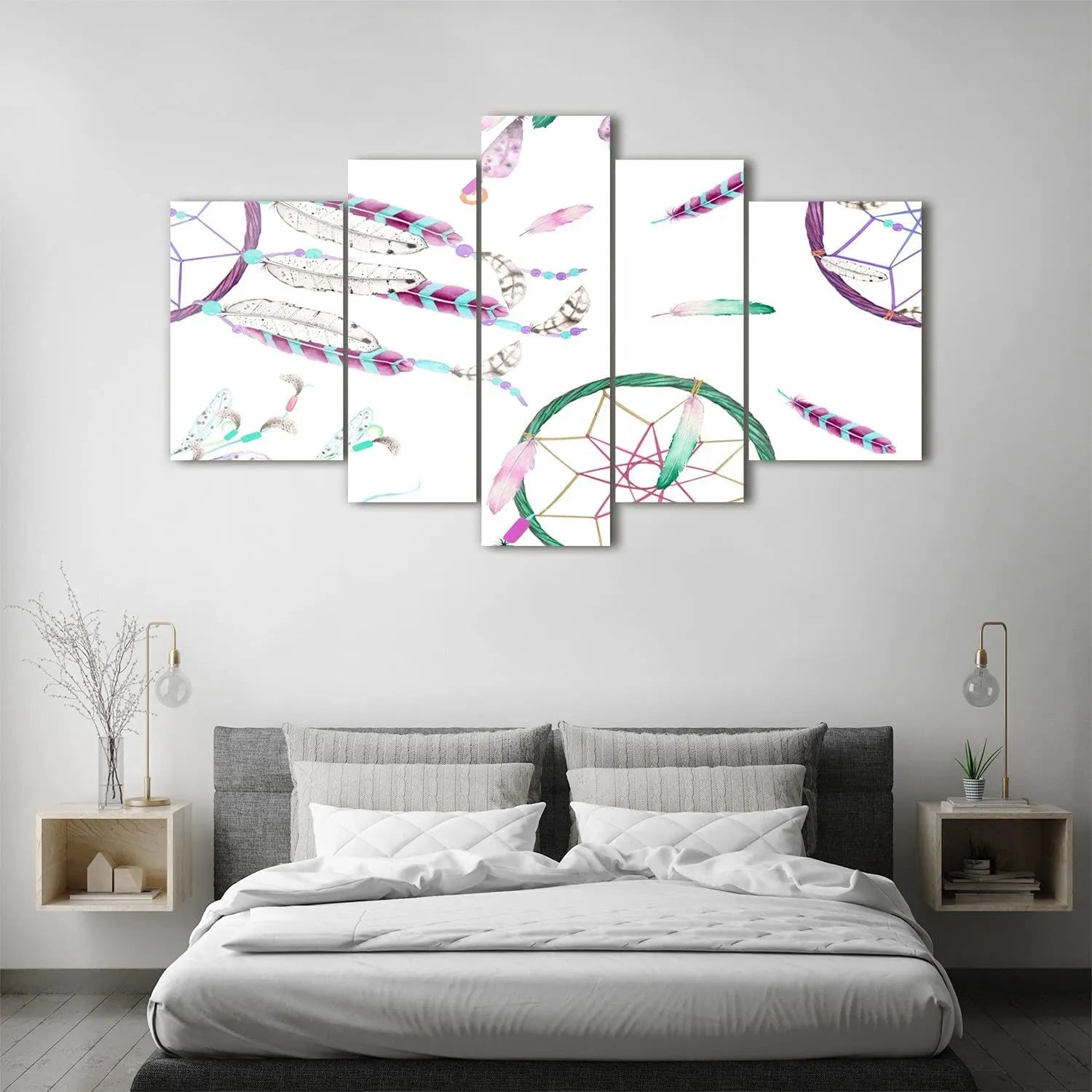 El centro del cuadro está adornado con un círculo de metal del que cuelgan plumas y cuentas que atrapan los sueños y los malos espíritus. Las plumas están disponibles en varios colores para adaptarse a todos los estilos y decoraciones.